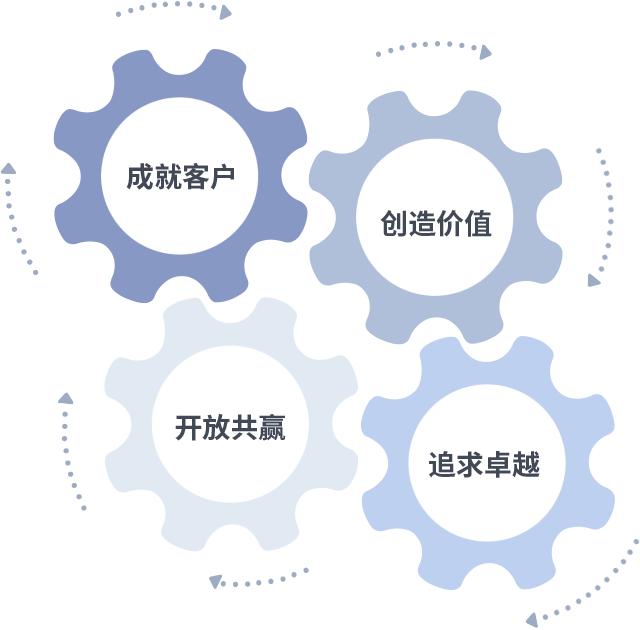 成就客户是一切决策的出发点,,,创造价值是衡量所有工作的标准,,,,追求卓越是我们做事做人的态度,,开放共赢是我们的格局也是最终的结果。。价值观的齿轮环环相扣,,,,推动着组织里的每个人不断向前。。。。